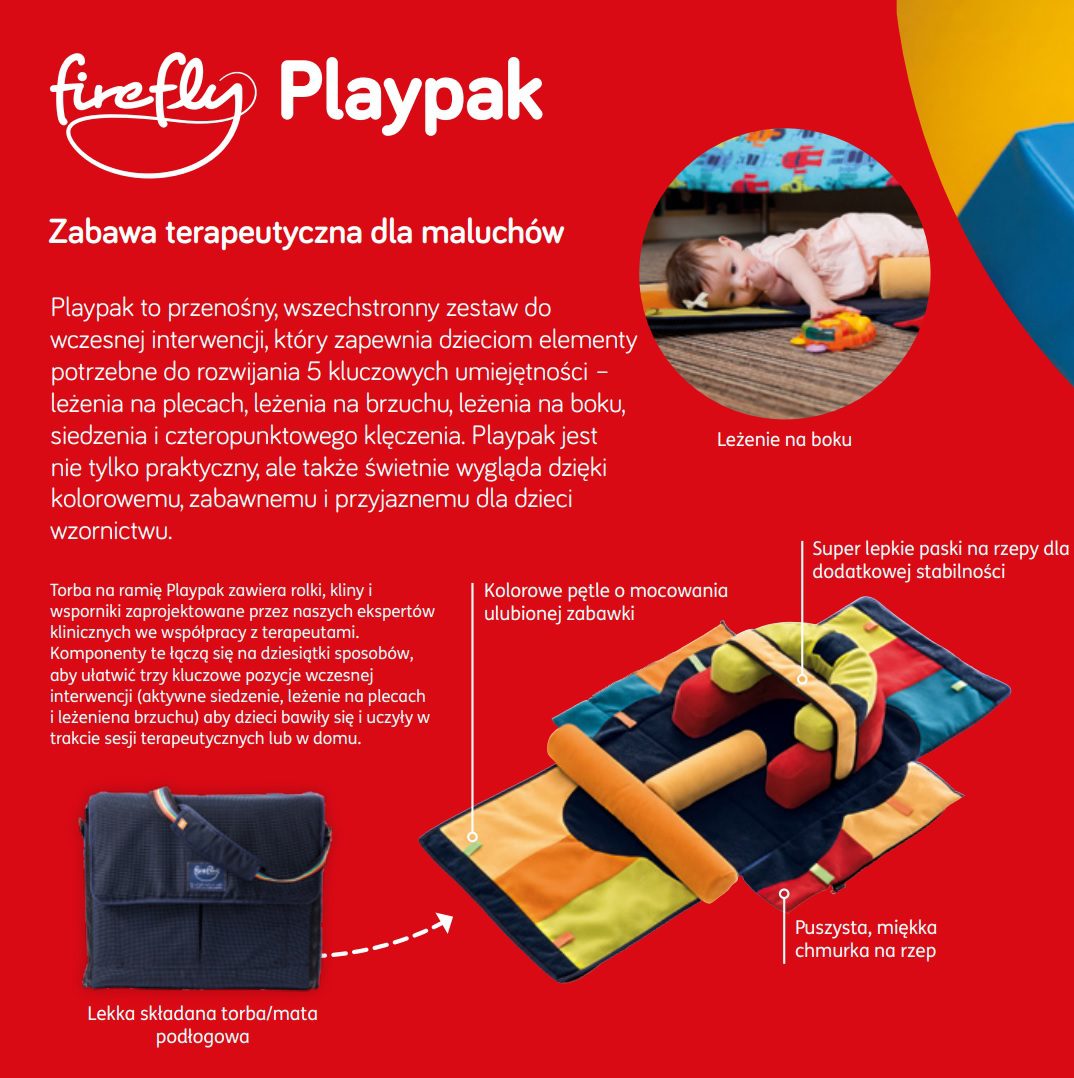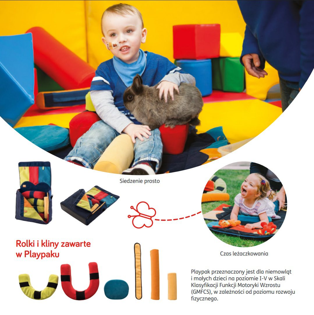 Playpak to przenośny zestaw terapeutyczny, który wspiera rozwój dzieci od urodzenia do czwartego roku życia. Działa skutecznie, ponieważ dostosowuje się do indywidualnych potrzeb rozwojowych dziecka. Może być stosowany zarówno w domu, jak i w podróży.